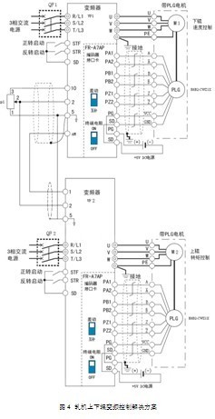 連軋機變頻器硬件接線圖如圖所示。VF1下輥變頻器的速度設(shè)定采用電位器,并連接了PLG差動輸入信號作為閉環(huán)矢量控制的反饋信號,跳線設(shè)置如圖4中標識所示,同時輸出轉(zhuǎn)矩信號給VF2變頻器。VF2上輥變頻器采用轉(zhuǎn)矩控制,其轉(zhuǎn)矩命令來自于VF1的輸出,速度限幅來自于VF1的速度。