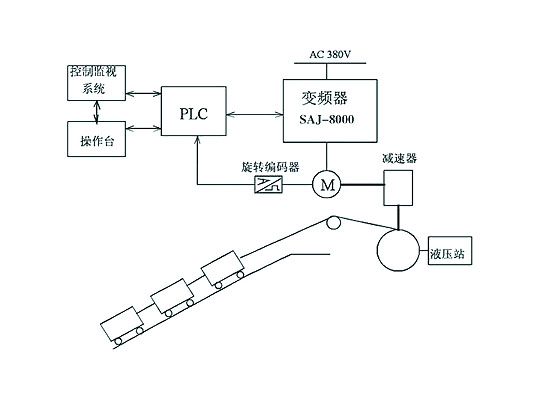 變頻器接入一制動單元和制動電阻,就可以滿足重車下行時的再生制動,實(shí)現(xiàn)平穩(wěn)的下行。井口還有一個液壓機(jī)械制動器,類似電磁抱閘,此制動器用于重車靜止時的制動,特別是重車停在斜井的斜坡上,必須有液壓機(jī)械制動器制動。液壓機(jī)械制動器受PLC和變頻器共同控制,機(jī)械制動是否制動受變頻器頻率到達(dá)端口的控制,起動時當(dāng)變頻器的輸出頻率達(dá)到設(shè)定值,例如0.2Hz,變頻器A、B端口輸出信號,表示電機(jī)轉(zhuǎn)矩已足夠大,打開液壓機(jī)械制動器,重車可上行;減速過程中,當(dāng)變頻器的頻率下降到0.2Hz時,表示電機(jī)轉(zhuǎn)矩已較小,液壓機(jī)械制動器制動停車。緊急情況時,按下緊急停車按鈕,變頻器能耗制動和液壓機(jī)械制動器同時起作用,使提升機(jī)在盡量短的時間內(nèi)停車。